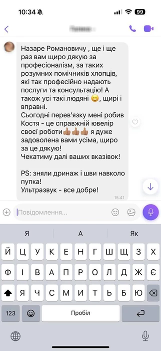 Хочу висловити слова подяки Назару Романовичу, безмежно вдячна Вам. В березні 23 року я була на мамопластиці, все пройшло чудово. Хоча було з чим повозитися, симетрія грудей яка і зайняла більше часу. На другий день після операції я самостійно мила голову, та сушила феном волосся. Це все зручно, хоча думала навпаки. Зараз любуюся своїми новими грудами. Я дуже задоволена. Ще побачимося, обов'язково. Дай Бог Вам міцного здоров'я та задоволених пацієнтів.