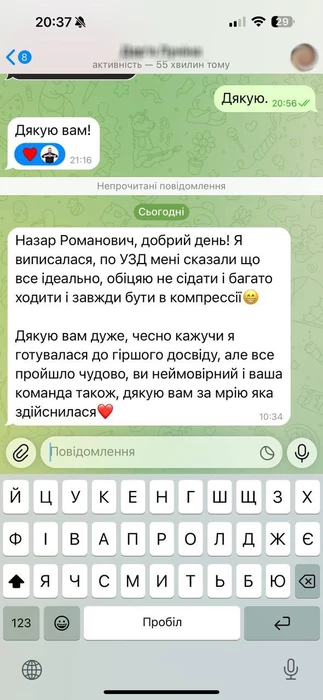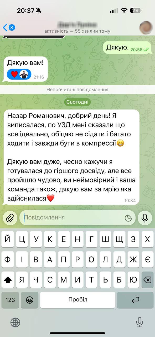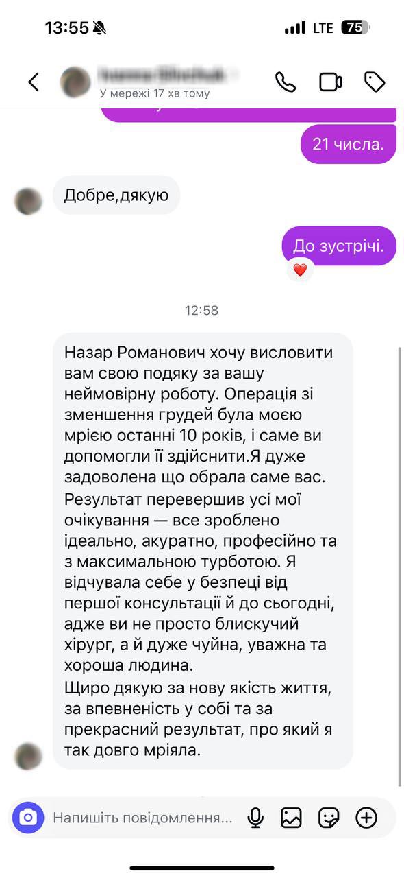 Дякую Назару Романовичу за суперську роботу. Зробила імплантацію грудей. Від наркозу відійшла дуже легко, шви тоненькі і загоїлися швидко, все пройшло на щастя без ускладнень. Тепер маю чудові нові груди великого розміру та форми як я і хотіла. Дякую, що послухали та підібрали мені правильний розмір)))