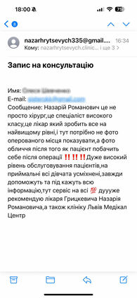 За консультацией обращайтесь к пластическому хирургу Назару Грицевичу – врачу с опытом работы 10 лет, кандидату медицинских наук. Также Вы можете проконсультироваться онлайн и отправить врачу фото для фотопрогноза операции.